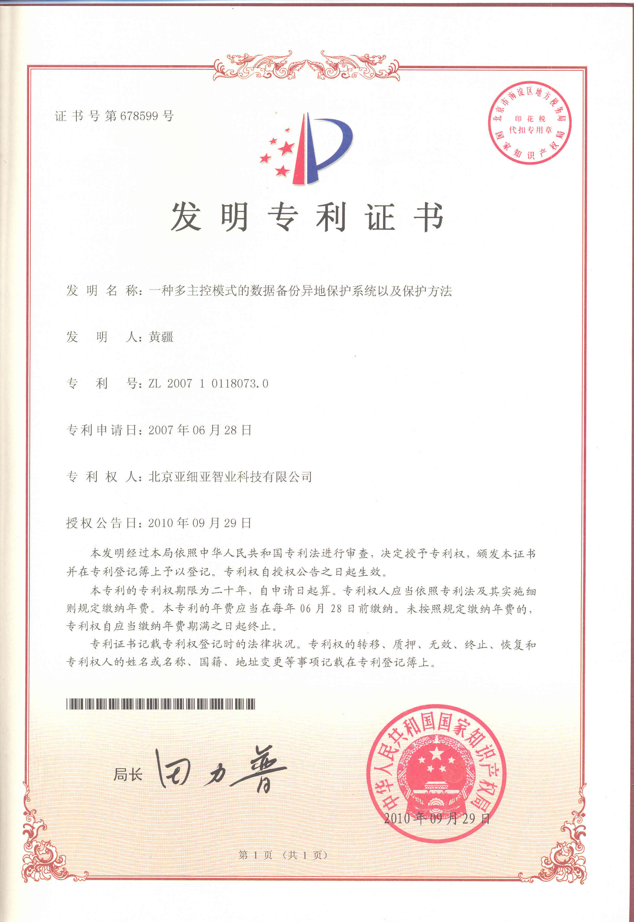 專(zhuān)利證書(shū)(一種多控模式的數(shù)據(jù)備份異地保護(hù)系統(tǒng))